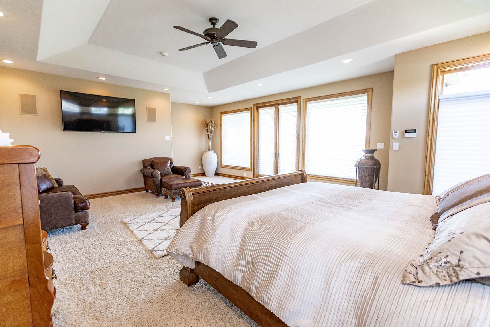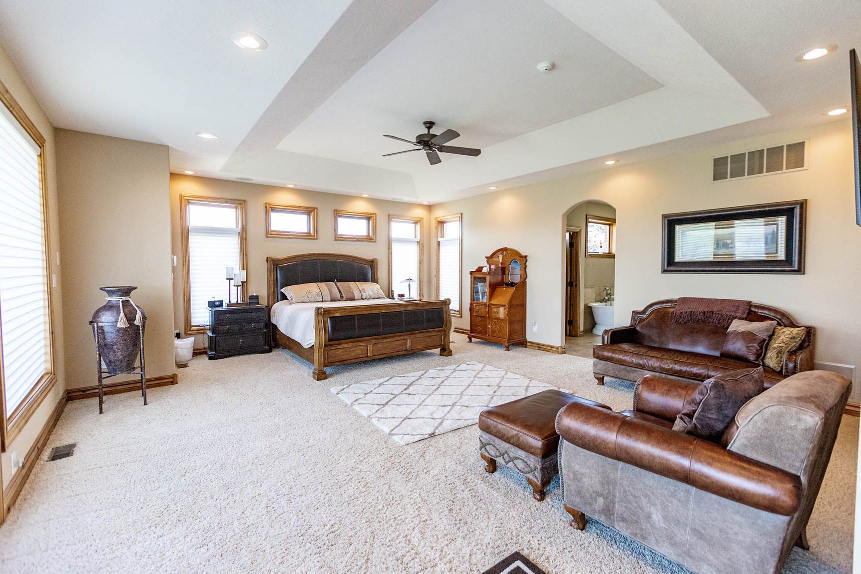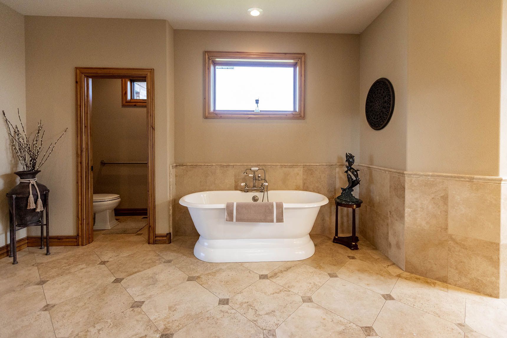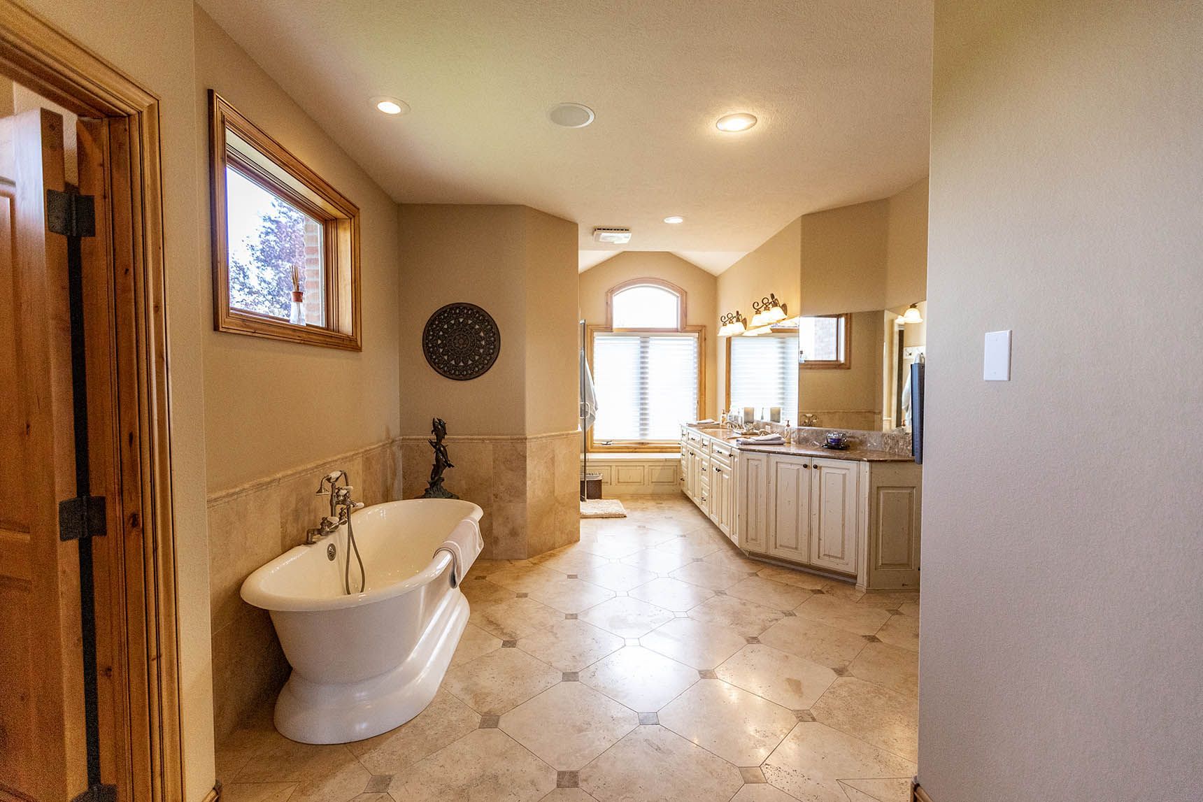 A large master suite with a spa-like bathroom including a clawfoot tub and large walk-in-shower