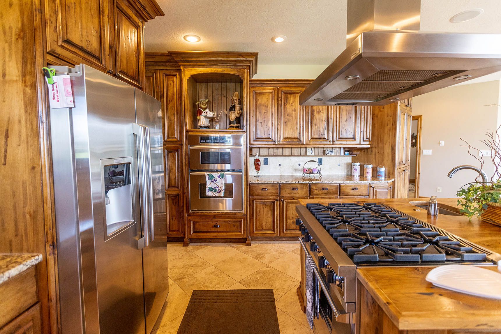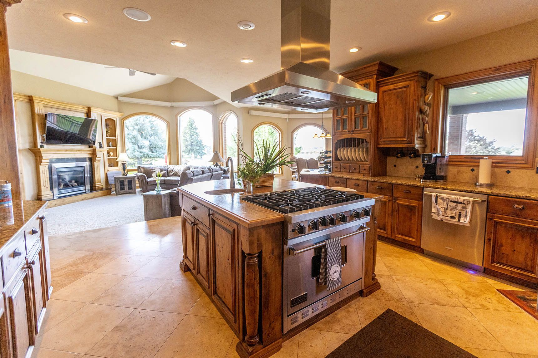 A luxury kitchen with a 6-burner gas stove and granite countertops that connects to an expansive living and dining area