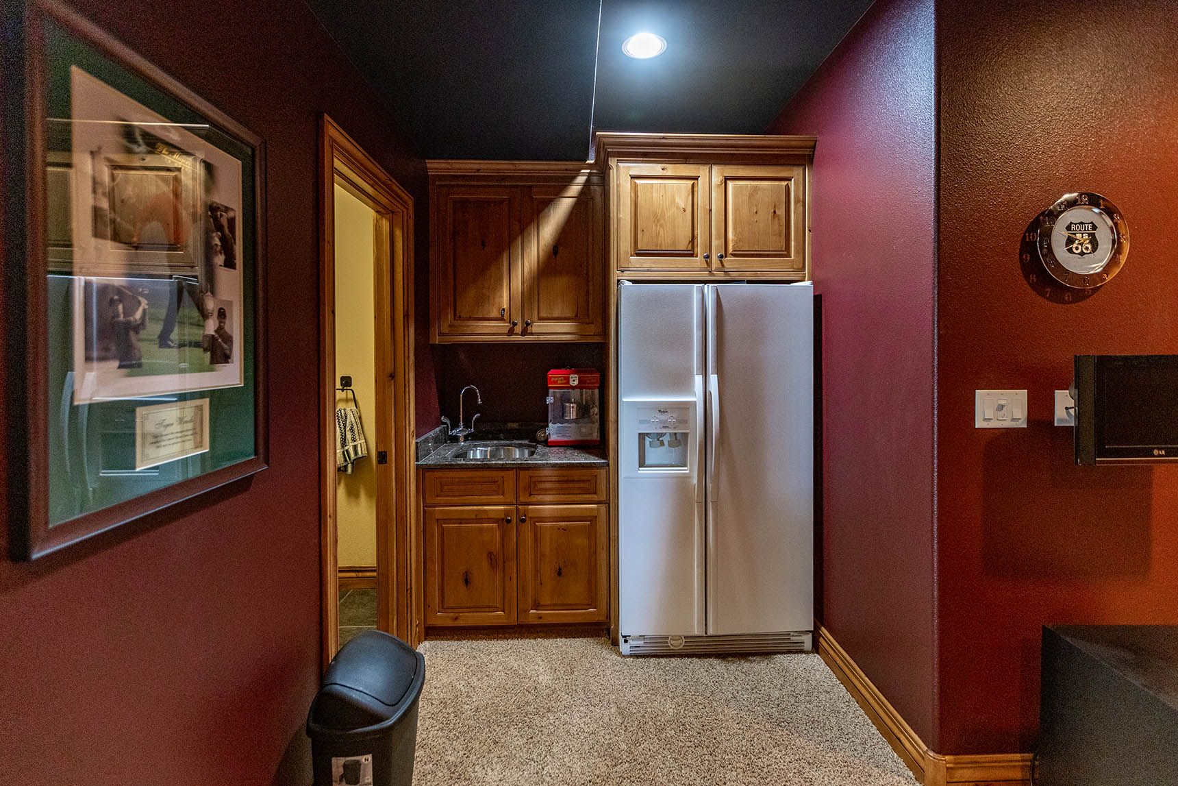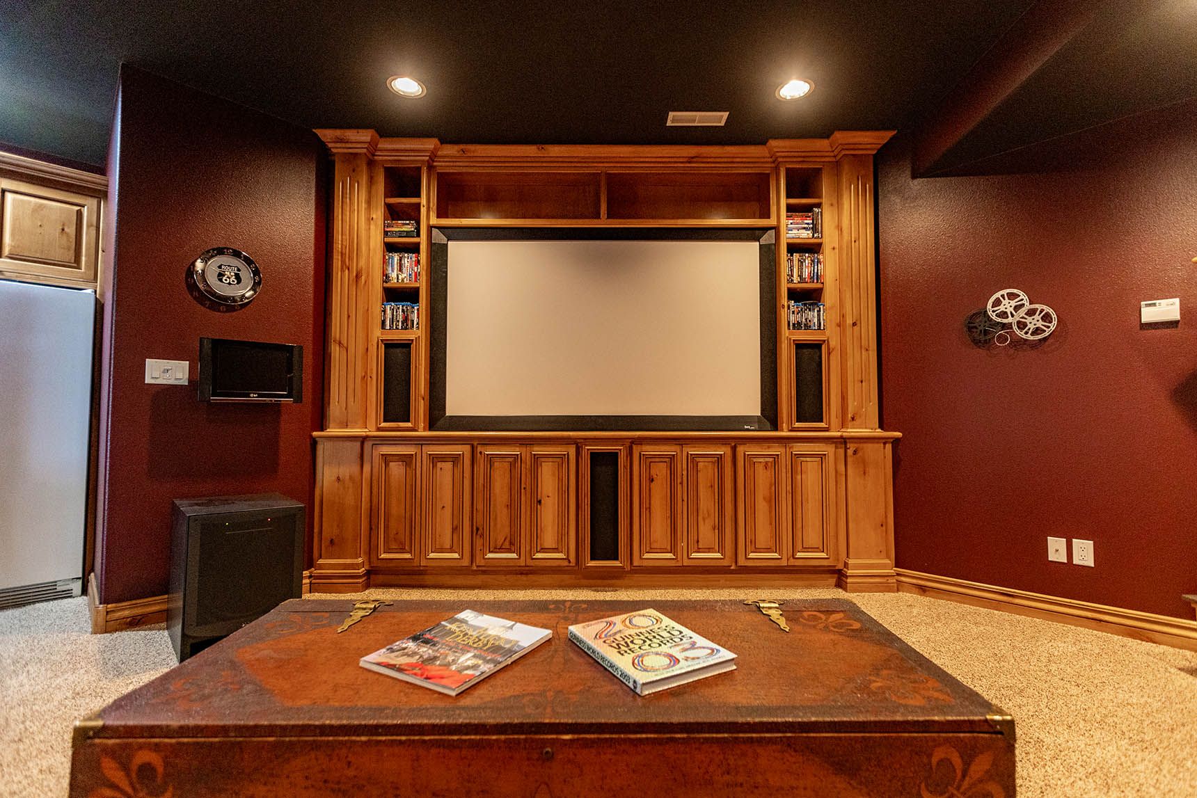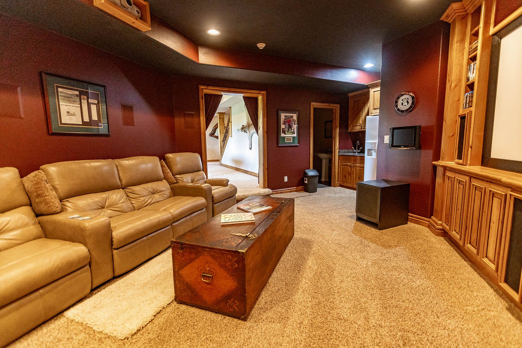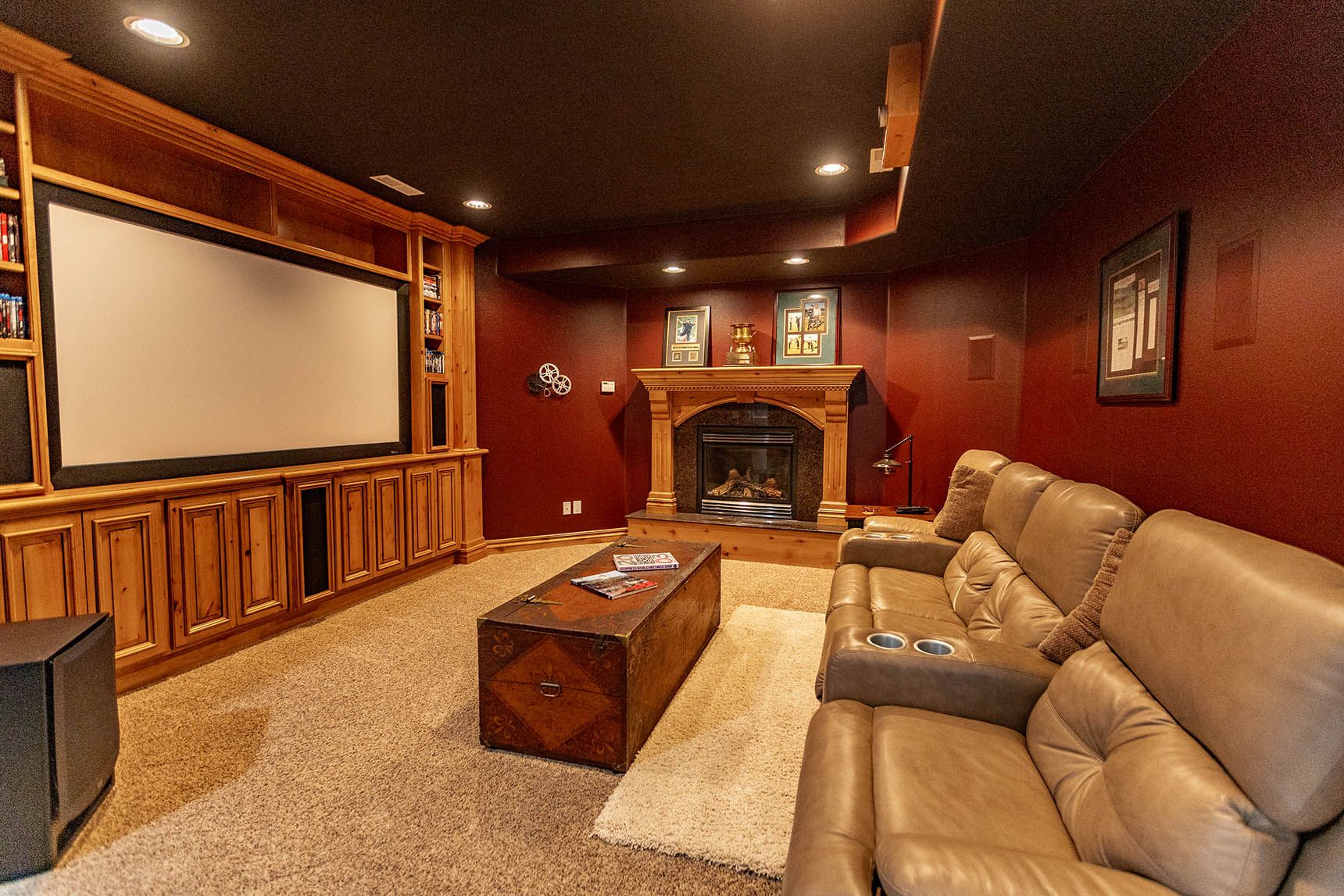 A one-of-a-kind theater room that includes a fireplace, a wet bar area, and a half bathroom for convenience