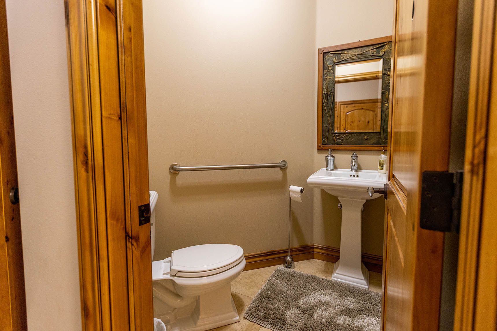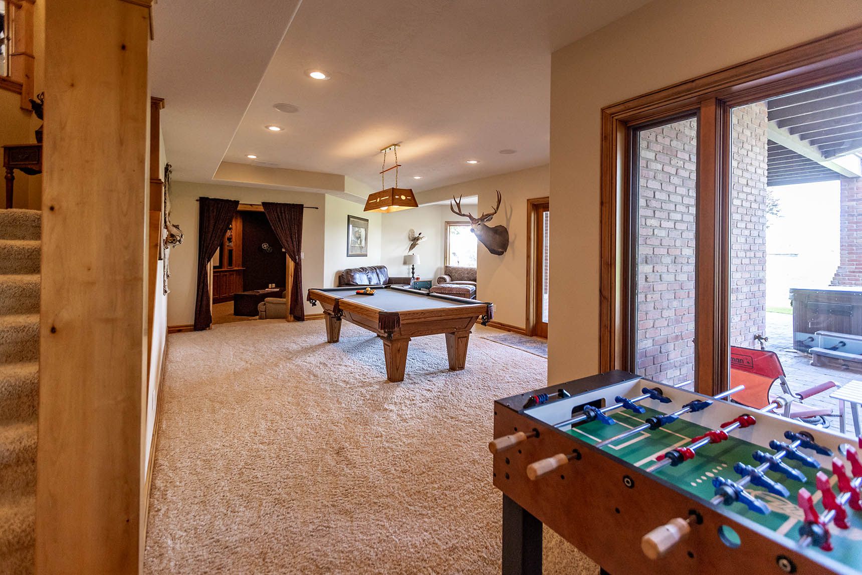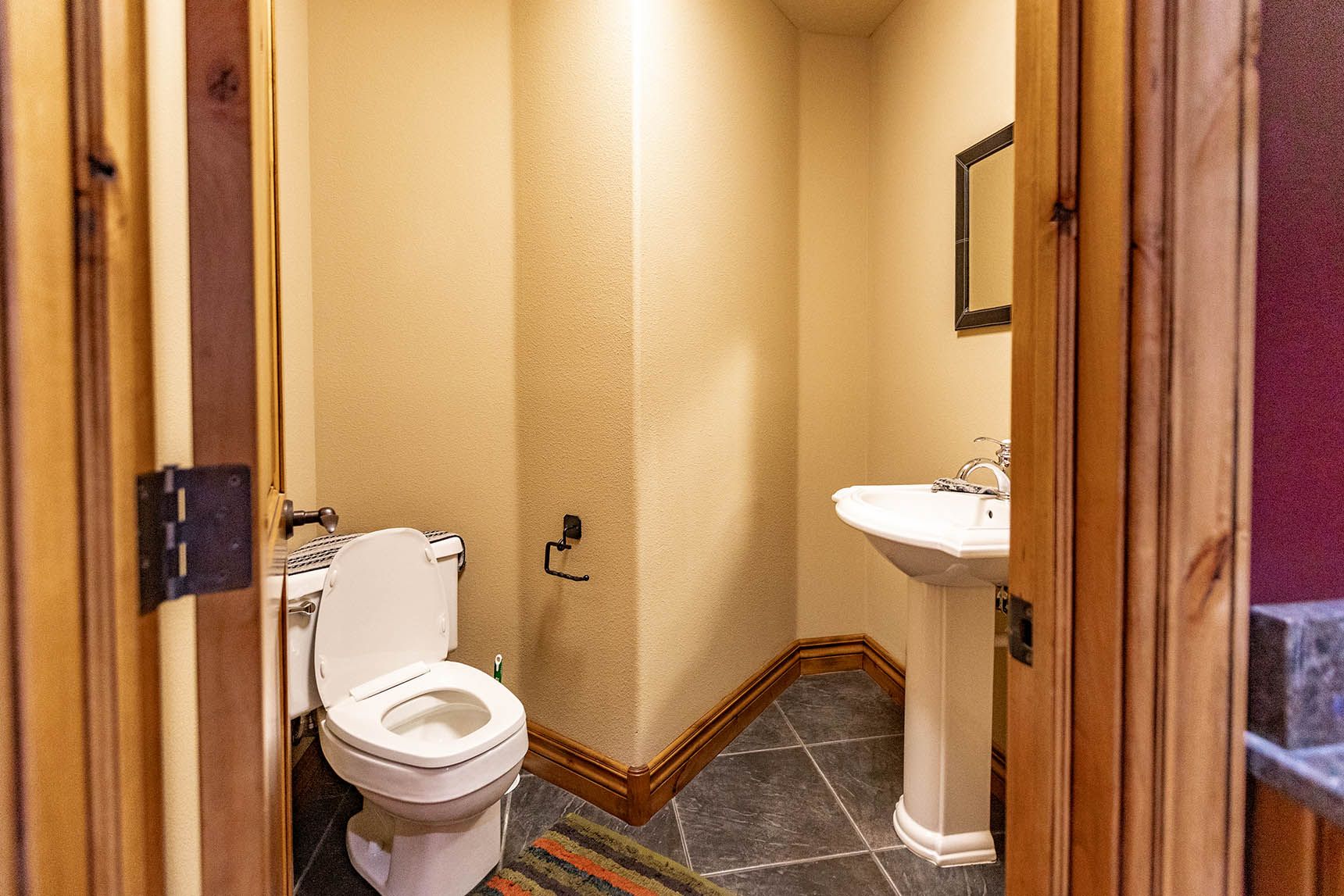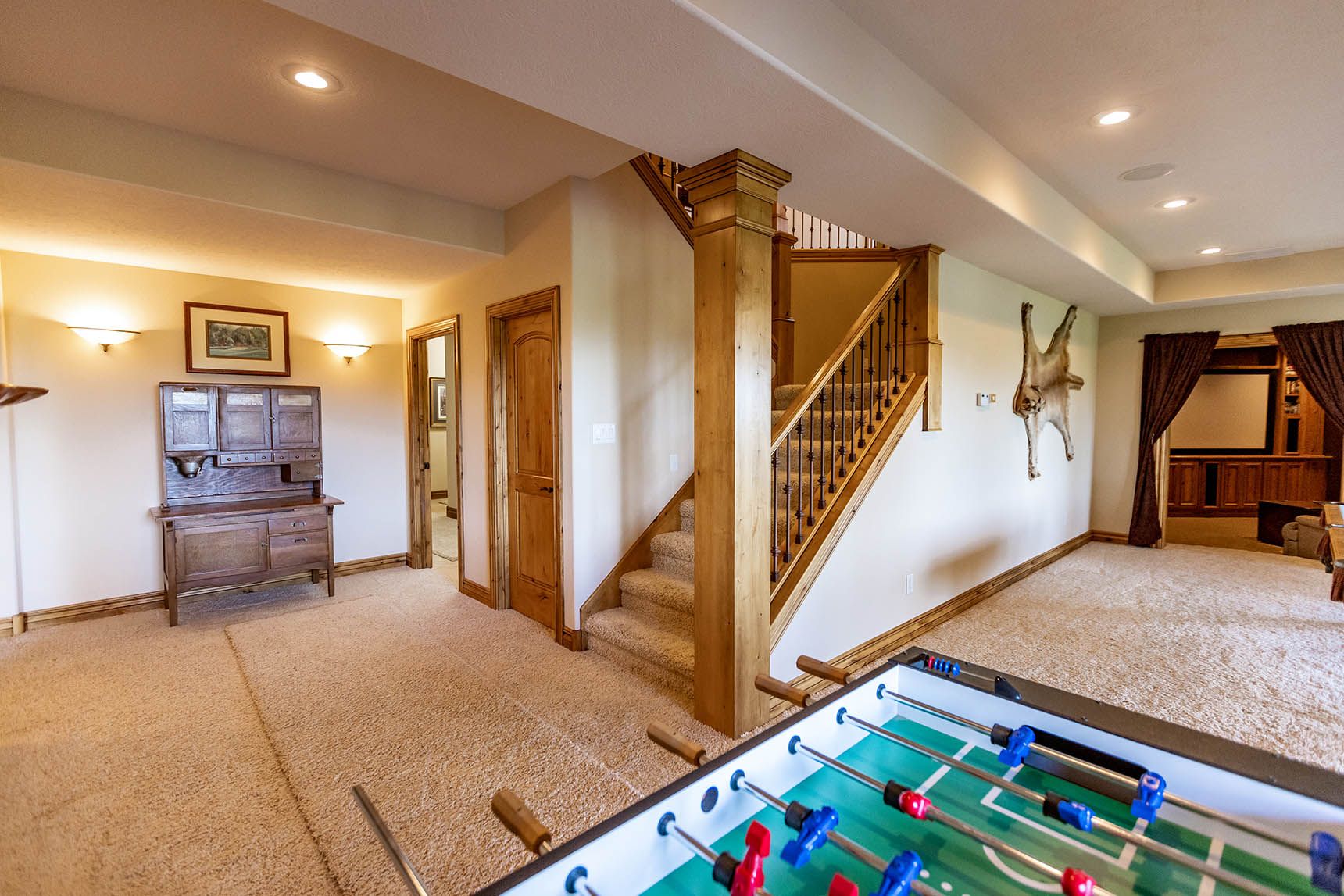 A one-of-a-kind theater room that includes a fireplace, a wet bar area, and a half bathroom for convenience