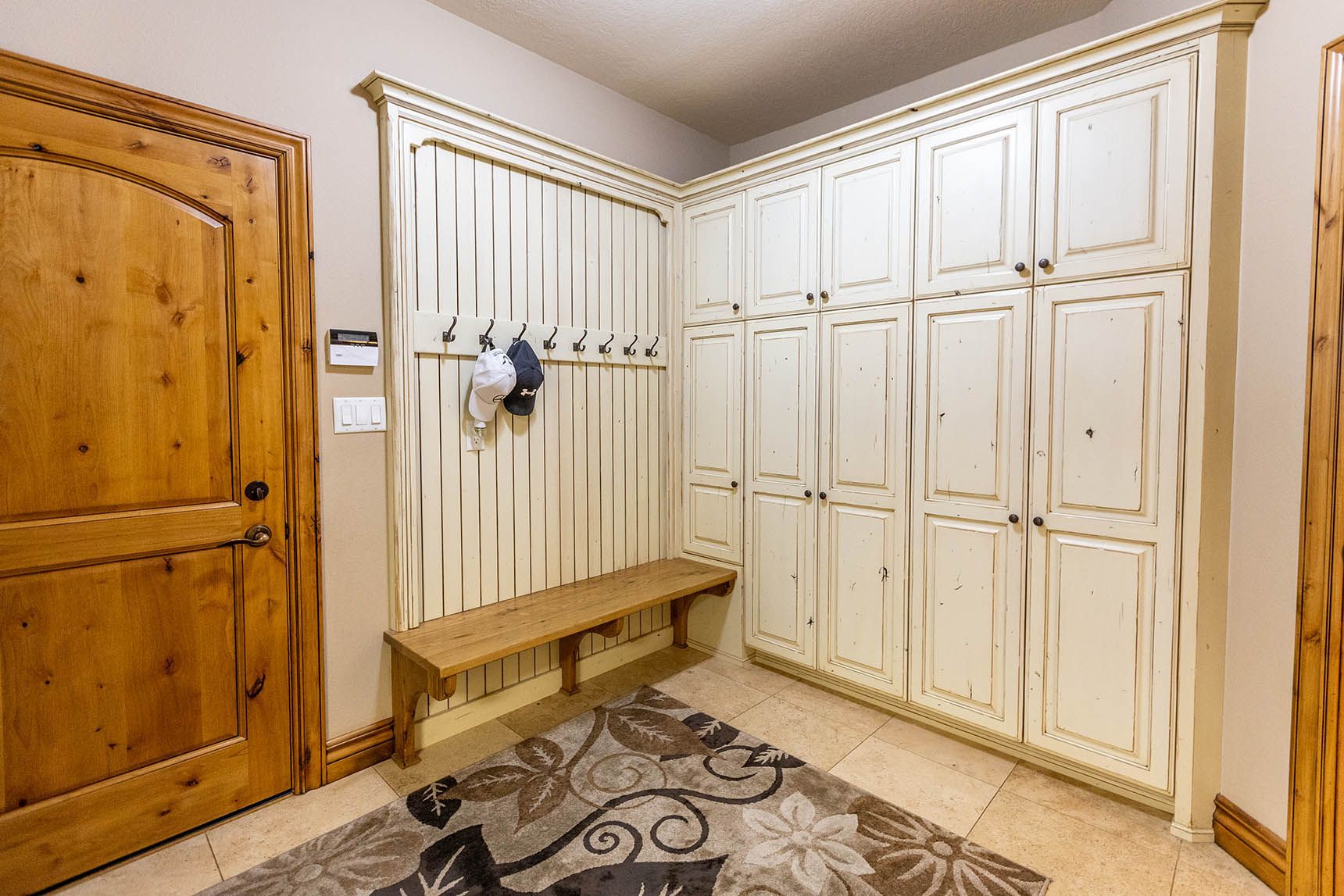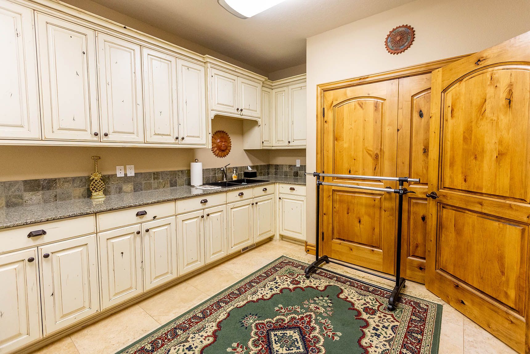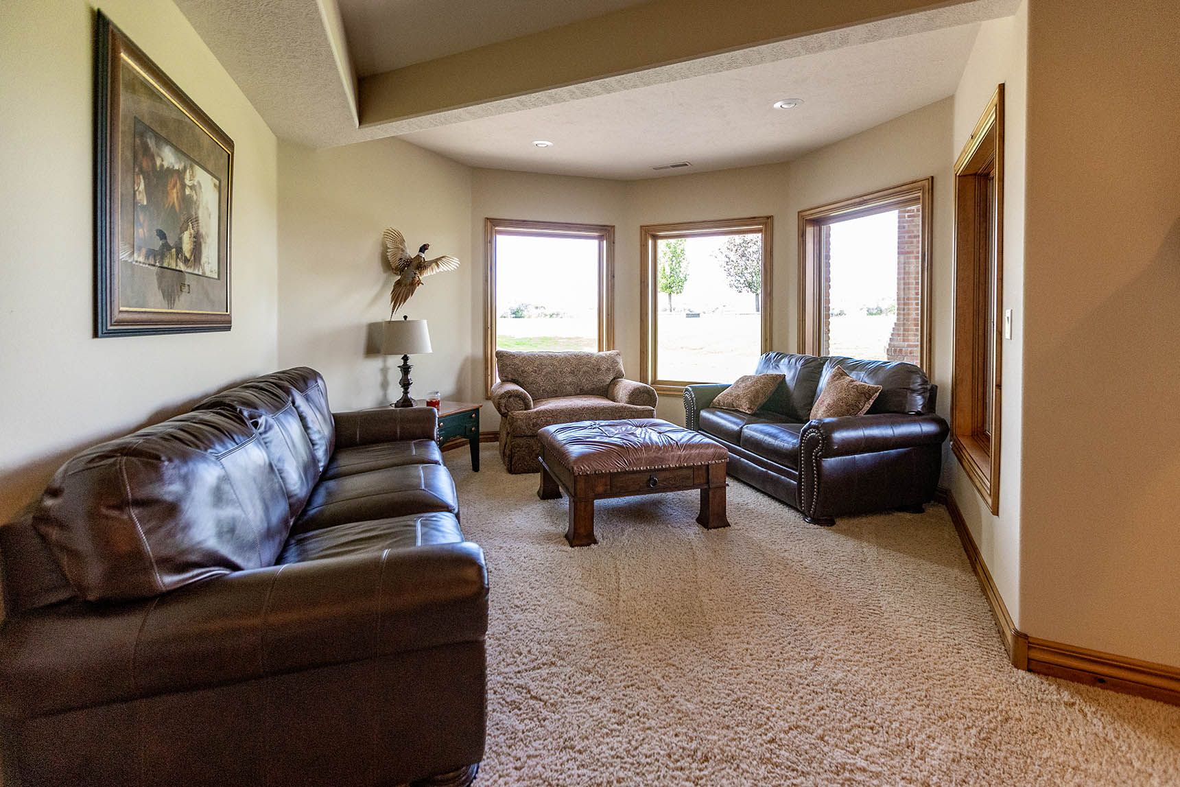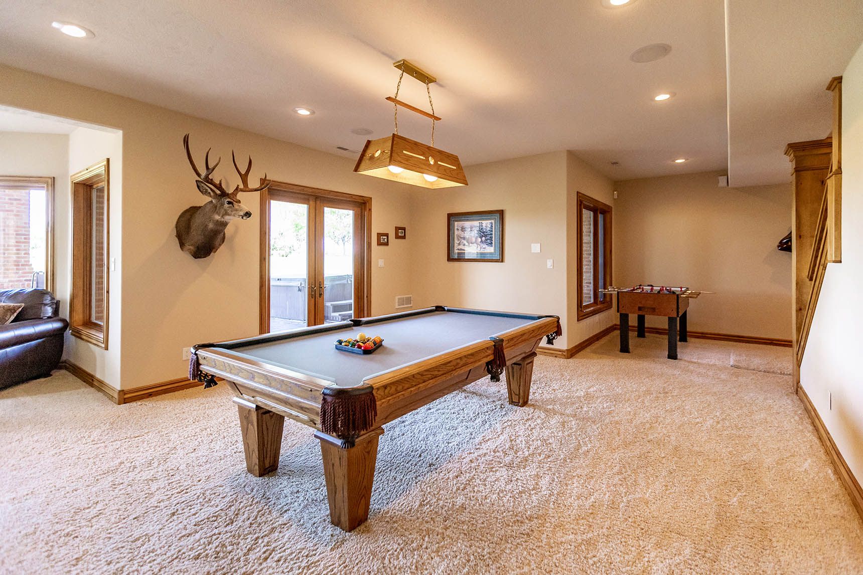 A one-of-a-kind theater room that includes a fireplace, a wet bar area, and a half bathroom for convenience